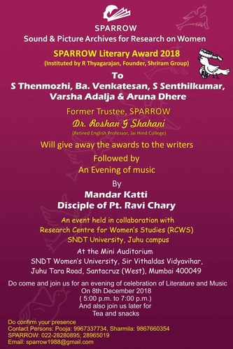 This Literary Award has been instituted by Mr. R Thyagarajan, co-founder, Shriram Group. This year we had a few more friends who came forward to support additional expenses. SPARROW trustees Dr Divya Pandey, Dr Usha Thakkar and friend and supporter from the US, Aravindan Kannaiyan and our well-wishers from Chennai, Bharathi Chandru and Chandru contributed to the event. The panel of juries this year were the same as last year: Publisher of the literary magazine Kalachuvadu, Mr. Kannan Sundaram, poet and editor of Kalachuvadu, Mr. N Sukumaran, and Dr C S Lakshmi (Ambai). The event was held in collaboration with the Research Centre for Women’s Studies, SNDT University.