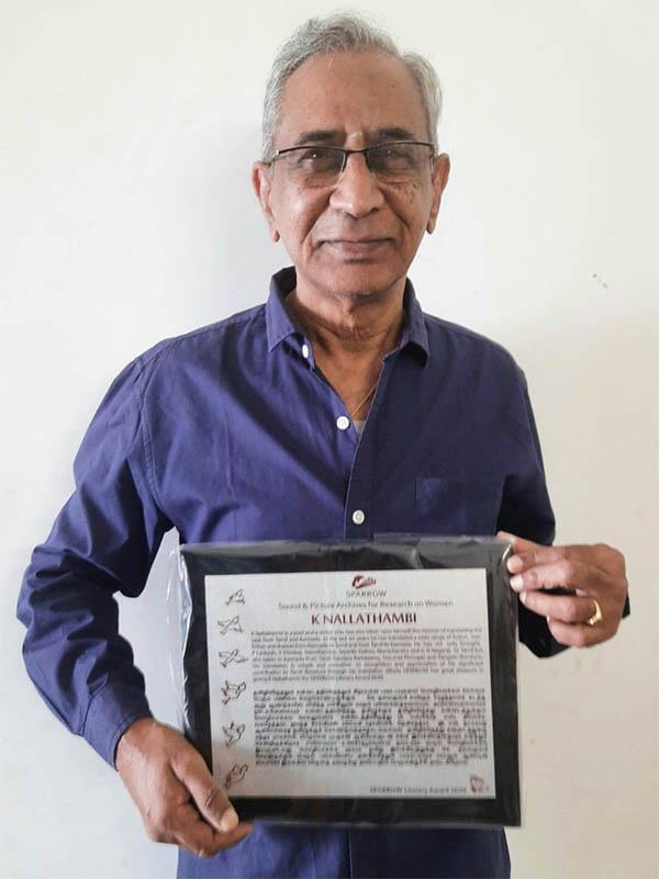 K Nallathambi is a poet and a writer who has also taken upon himself the mission of translating the best from Tamil and Kannada. In the last six years he has translated a wide range of fiction, non-fiction and dramas from Kannada to Tamil and from Tamil to Kannada. He has not only brought P Lankesh, S Diwakar, Vasudhendra, Jayanth Kaikini, Nemichandra and G N Nagaraj to Tamil but also taken to Kannada from Tamil Sundara Ramasamy, Perumal Murugan and Sangam literature. His translation is simple and evocative. In recognition and appreciation of his significant contribution to Tamil literature through his translation efforts SPARROW has great pleasure in giving K Nallathambi the SPARROW Literary Award 2020.