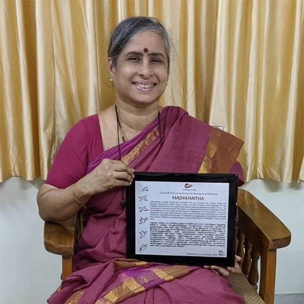 Madhumitha is a poet, lyricist and a translator who can translate from Sanskrit, Telugu and Kannada. Although her mother tongue is Telugu she feels at home in other languages she has mastered. Along with her own creative work she has taken up translation as a labour of love. She has brought to Tamil Barthruhari’s “Niti Sataka” on polity and ethics and his “Subhashitha Trishati” encompassing the entire human life and Kalidasa’s “Meghaduta” and “Ritusamhara”. Along with translations from Telugu and Kannada her taking up the immense task of translating from Sanskrit needs to be celebrated and recognised. In recognition and appreciation of her efforts to translate from Sanskrit SPARROW has great pleasure in giving Madhumitha the SPARROW Literary Award 2020.